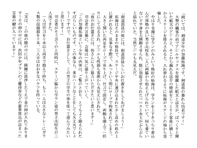 剣道部顧問の披露宴が行われるということで、会場である巨大温泉ホテル「筍温泉」に部の代表としてやってきた学ランの拓海と涼介。余興では剥けかけのをぷらぷらさせ、知り合った兄弟と楽しく温泉で裸のお付き合いをしちゃいます。学ランや浴衣をはだけさせた元気のいい少年たちのえっちな披露宴をぜひどうぞ。