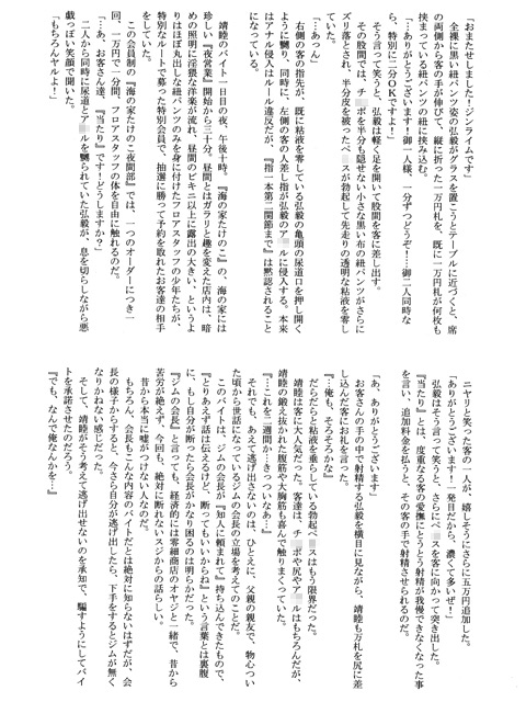 夕立でびしょ濡れになった後、一緒にお風呂に入ってからだをあっためる靖睦と悠介。すると、ちょっとだけ年上の靖睦のが気になった悠介は、目の前でしっかりと見せてもらい……。また、海の家できつきつビキニ姿でアルバイトをしたり、『夜間部』では紐パンツから半剥けのを飛び出させてお客さんを悦ばせたりしちゃいます。ムエタイのエキシビションマッチや恥ずかしい罰ゲームもたっぷりじっくりとご堪能ください。