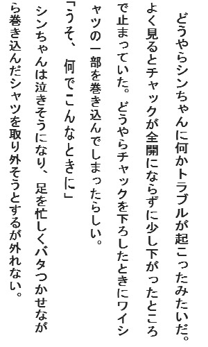 紺色の制服の半ズボンのシンちゃんにつきまとい、様々な行動をチェックした。
