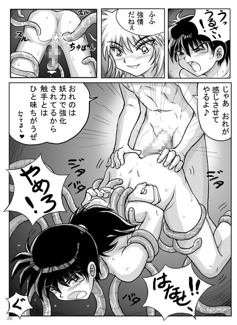 鍾乳洞へ妖怪退治のためにやって来た琥珀は、岩壁に付着した白いべとべとを不思議に思いながら奥へと進むといきなり無数の触手に襲いかかられてしまいます。そこへ白童子が現れ、彼の操る触手によって着物を、さらにはふんどしをも剥ぎ取られ、先っちょまでしっかりと皮のかぶったかわいらしいのがぽろりんこ。内部へと容赦なくズププッと侵入してくる触手の刺激によってぴんと勃ち上がらせ、白童子のと一緒にしこしこされたり初めてを奪われたりしちゃうのをお楽しみください。妖力で寸止め状態にされて達するに達せず必死にお願いするのも必見です。