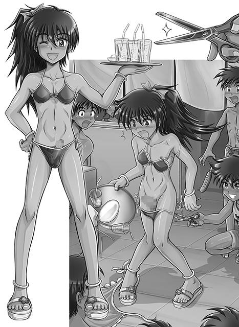ナギサに超レア物のDVDを貸したところ、全然返そうとしないだけでなくようやく取り戻した時にはぐしゃぐしゃに粉砕されていて激怒するセイジ。そこで海の家で働かせて弁償させることに。女物のビキニからピンク色の先っぽをはみ出させ、男性客の視線を釘付けにしながら忙しくお仕事をするナギサをお楽しみください。いたずらで紐ビキニを切られて皮かむりのがぽろりんこしたり、よく振ったラムネのビンを突っ込まれたりも。また、合宿中にガマンできなくなってロッカールームで大好きなリュウキ先輩のサカユニをよごしちゃう淫らなレンもどうぞ。