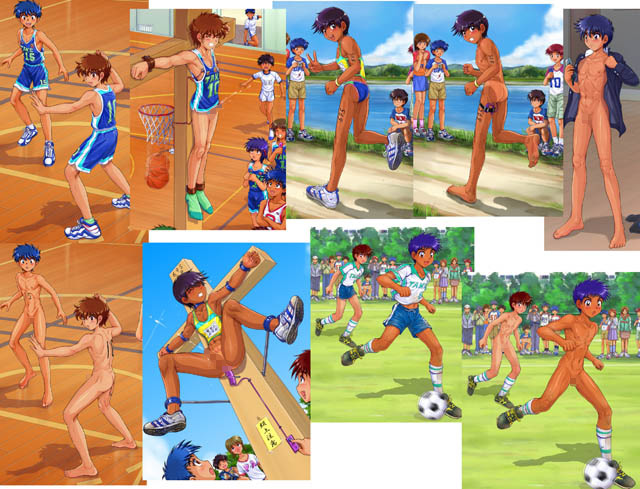 水着のひもがゆるくて飛び込む最中に脱げそうになってしまう水泳部の吉岡くんや、道着姿がりりしい空手部の赤羽くんなど、いろんな部活に励む男の子たちがいっぱい。そんなおいしそうな少年たちがみんな磔にされてしまいます。しかも、バスケやサッカーのゴールがスイッチと連動していてむりやり快感を与えられるなど、うれしい仕掛けも。みんなに見られながらスポーツ少年たちが剥けきっていないのをぴんぴんかちかちにしちゃいます。