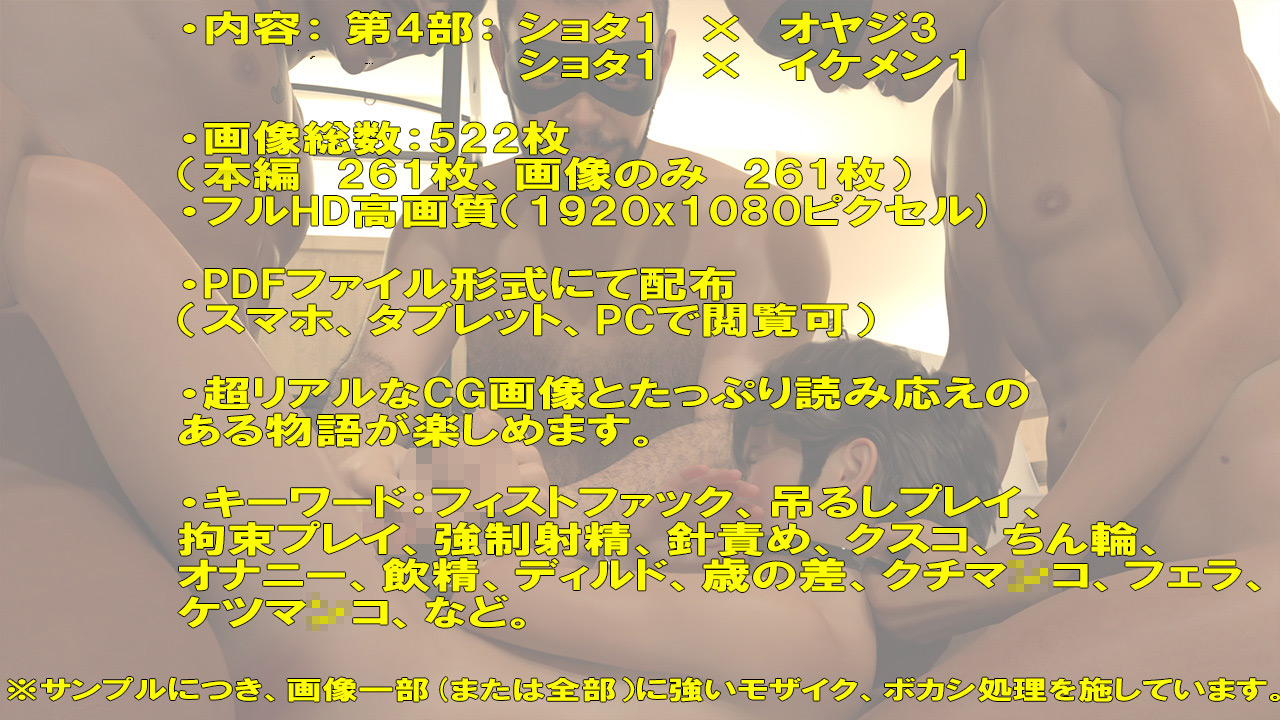 今回は、『第4部:性○○』ということで、主人公、ダイチが初めての客となる3兄弟に、色んなプレイを強要されて弄ばれる様子を、ひとつひとつのプレイに多くのページ数を割き、生々しい描写になっていると思います。