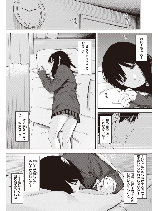 親に愛されずに育った杏月(あずき)と光葵(こうき)の兄妹は、お互いの自慰行為を見せ合うことで絆を深めていた。このままの関係がずっと続くと思っていた矢先、兄から「恋人ができたので関係を終了したい」と告げられた。