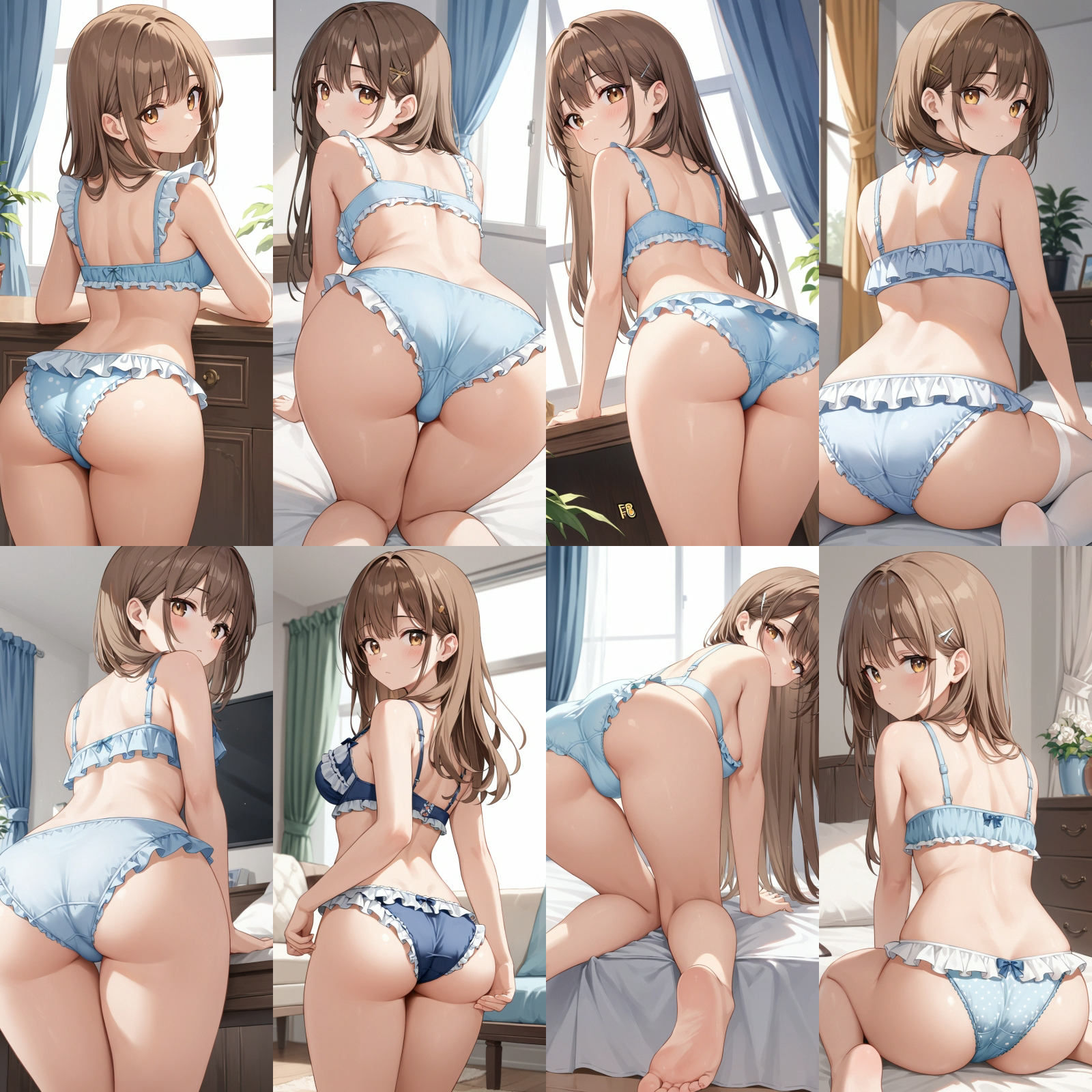 開脚ポーズ、四つん這いポーズ、立ち姿、お尻、ローアングルなど
